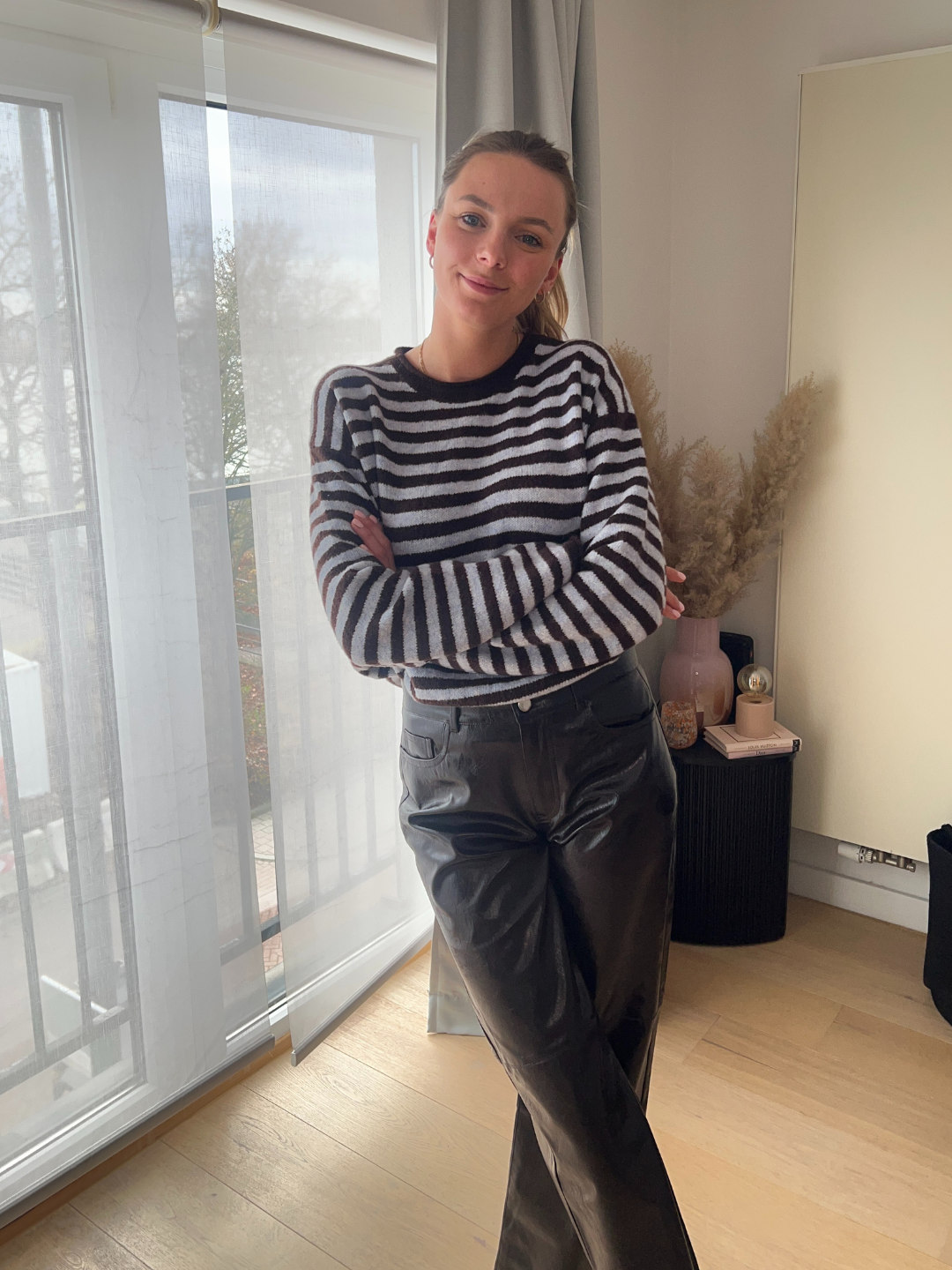 Onze Striped knit blue valt normaal, voelt licht en comfy aan. Prachtige kleurcombinatie met het donkerbruine en heldere blauwe